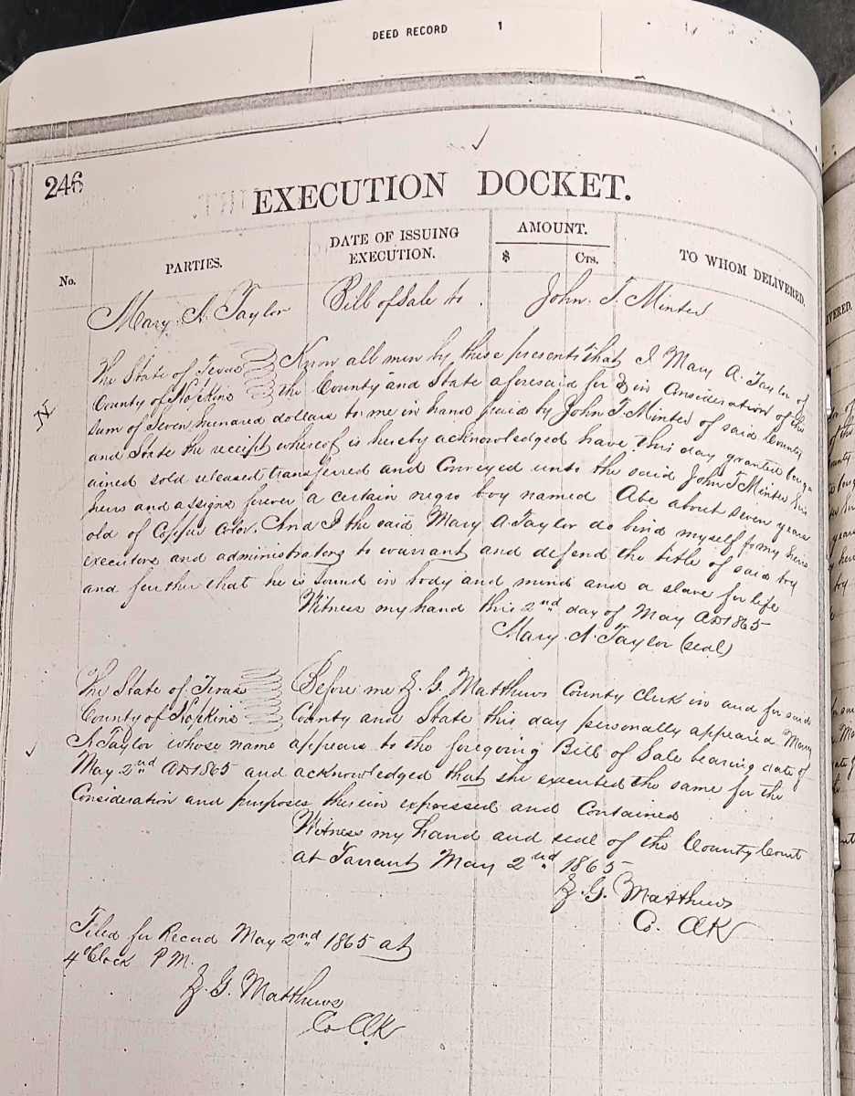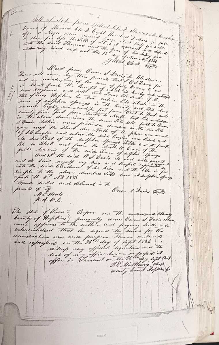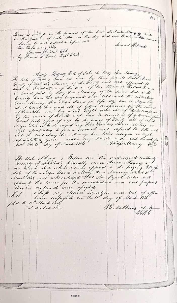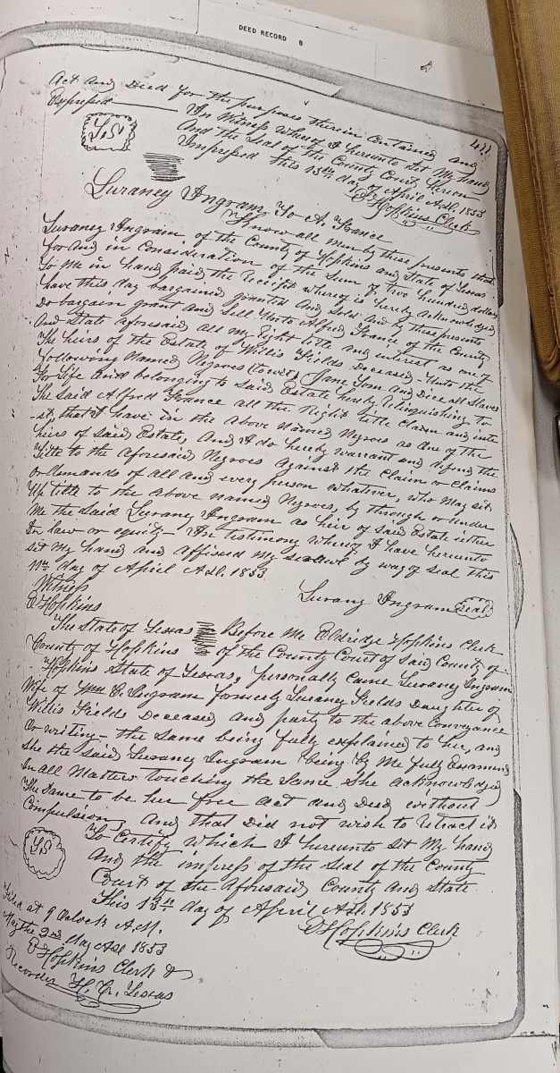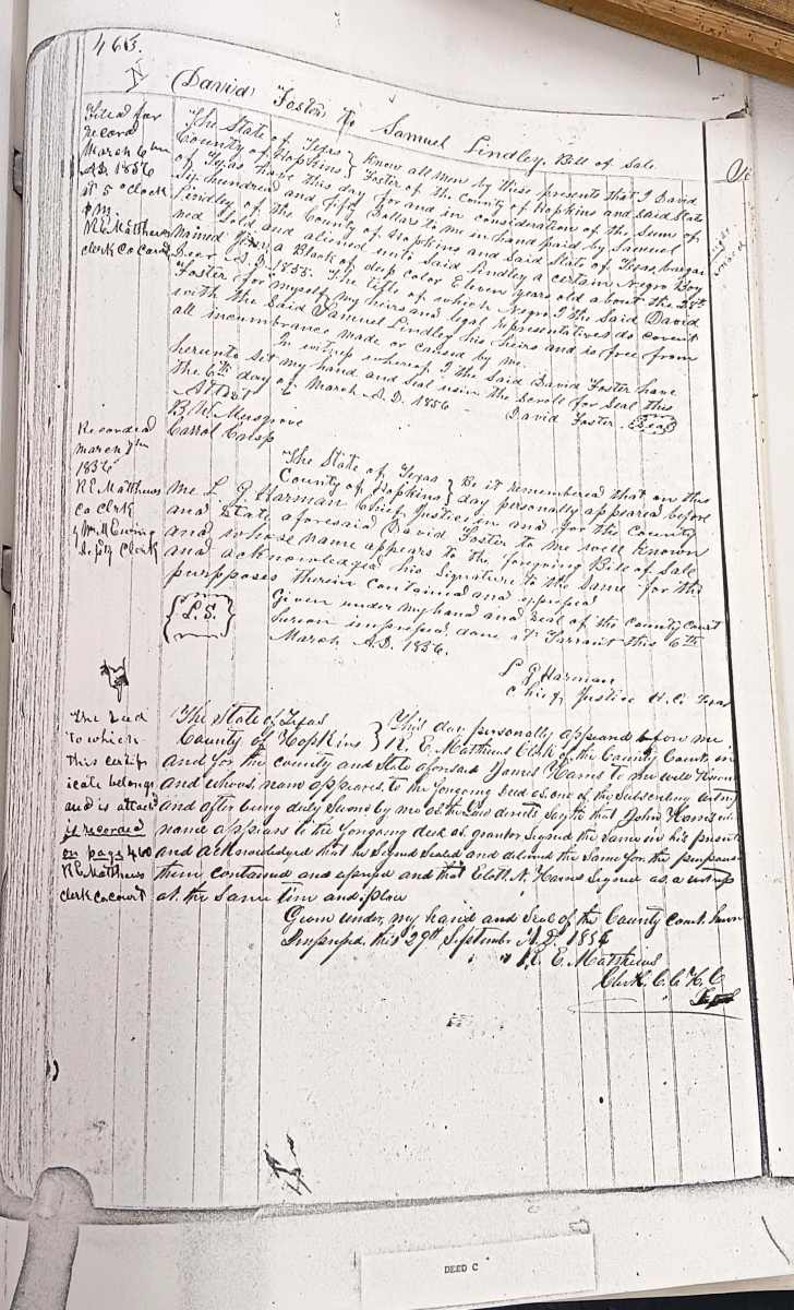 Researching African American families in Hopkins County often means working through gaps in the historical record, changes in names, and records created before and after emancipation. This page highlights local resources that may help identify individuals, families, communities, and connections over time. Some of these records document enslavement and slave sales and may be difficult to read, but they can also provide important evidence for family history research.