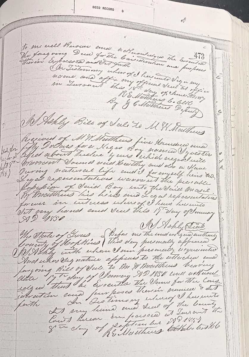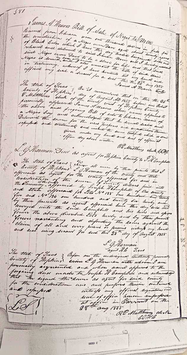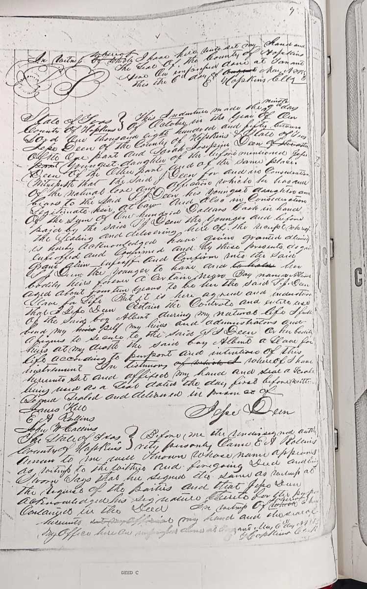 | Hopkins by John L. Nancy S. Hill, Attorney | Willeson, Paulina | 10-20-1850 | 09-10-1851 | B-231 | Bill of Sale — A negro woman slave by the name of Rachel Ann aged about 18 years and her child named Jim aged 1 year. |