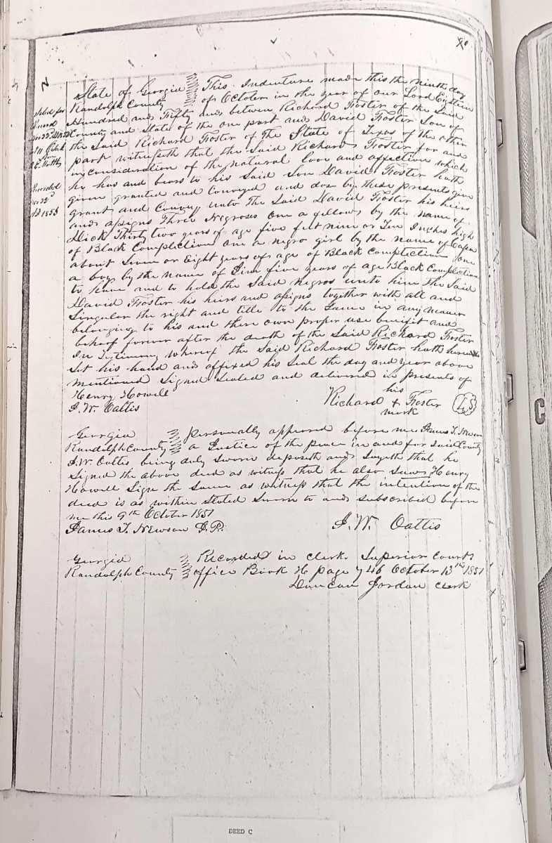 | Funderburgh, Reece C. et al | Crook, Richard R. | 09-05-1856 | 08-24-1857 | D-464 | Bill of Sale — A negro woman and two children, woman named Rachel aged 22 years old, boy named Lewis aged 5 years old, girl named Mary aged 3 years old. |