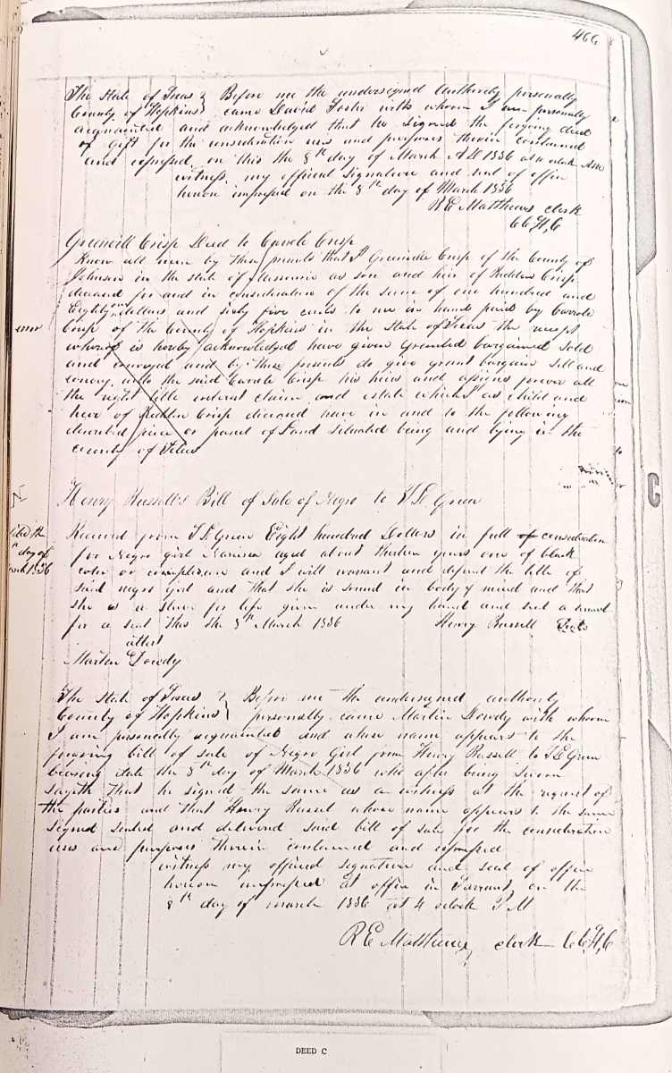 | Russell, Henry | Green, T.L. | 03-08-1856 | 03-08-1856 | C-466 | Bill of Sale — Negro girl Narissea aged about 13 years. |