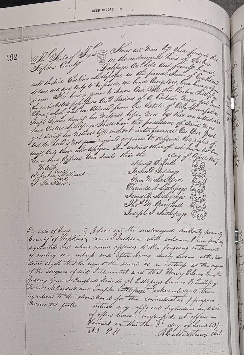 | Giddings, James R. et al | Littlepage, Eveline | 04- -1857 | 06-03-1857 | D-392 | Bill of Sale — A negro girl named Ann. Previously belonged to grantor's grandfather, Joseph Lovin. |