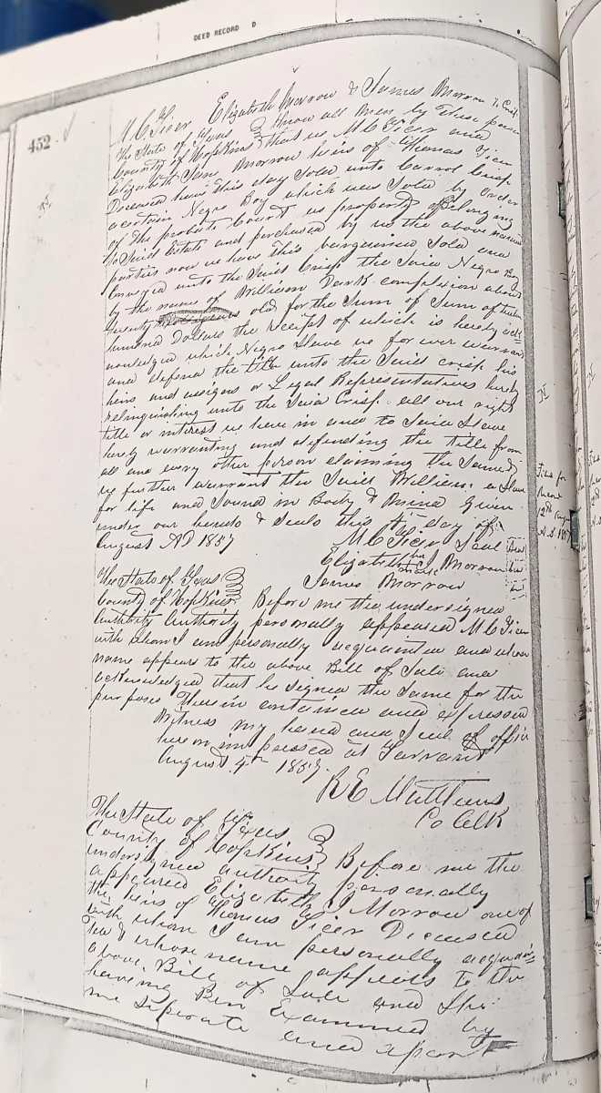 | Morrow, Elizabeth et al | Crisp, Carroll | 08-04-1857 | D-452 | Bill of Sale — A negro boy by the name of William about 20 [illegible] years who had belonged to the estate of Thomas Ticer. Was purchased by the Morrow's. | |